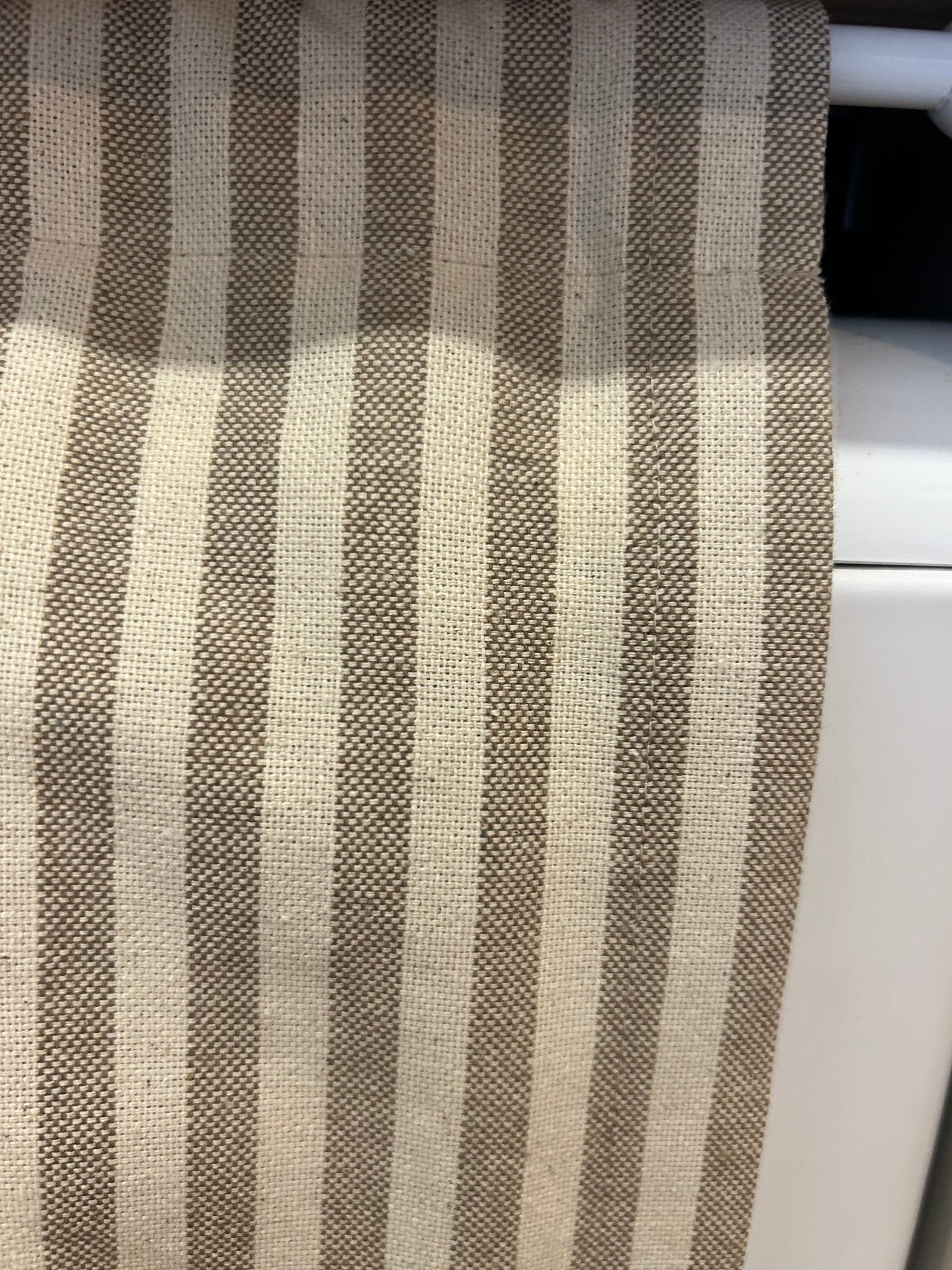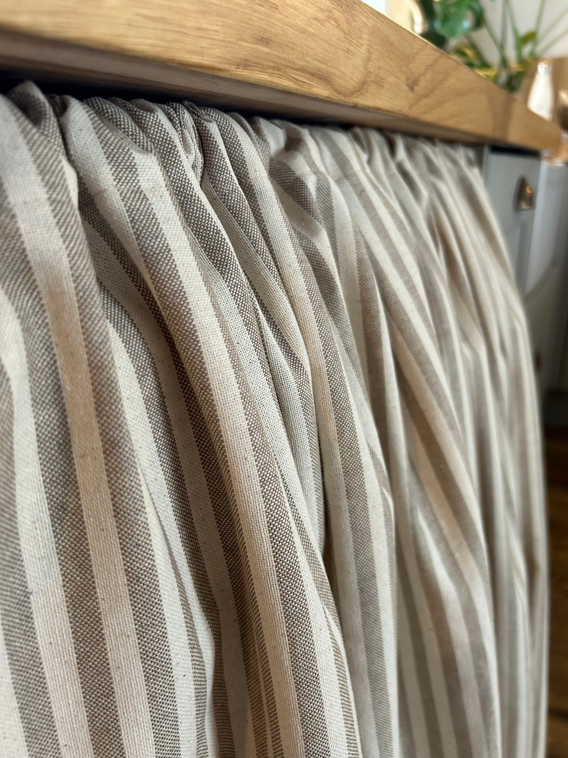 Striped Hideaway Curtain in natural and beige stripe. Perfect for hiding washing machines, appliances or even as an alternative to cupboard doors. Handmade using cotton fabric. Will fit 60cm wide space with gather as photographed or slightly wider space with less gather, with a 89cm drop and can be fitted using net curtain wire, or as we have a twist & fix rod.