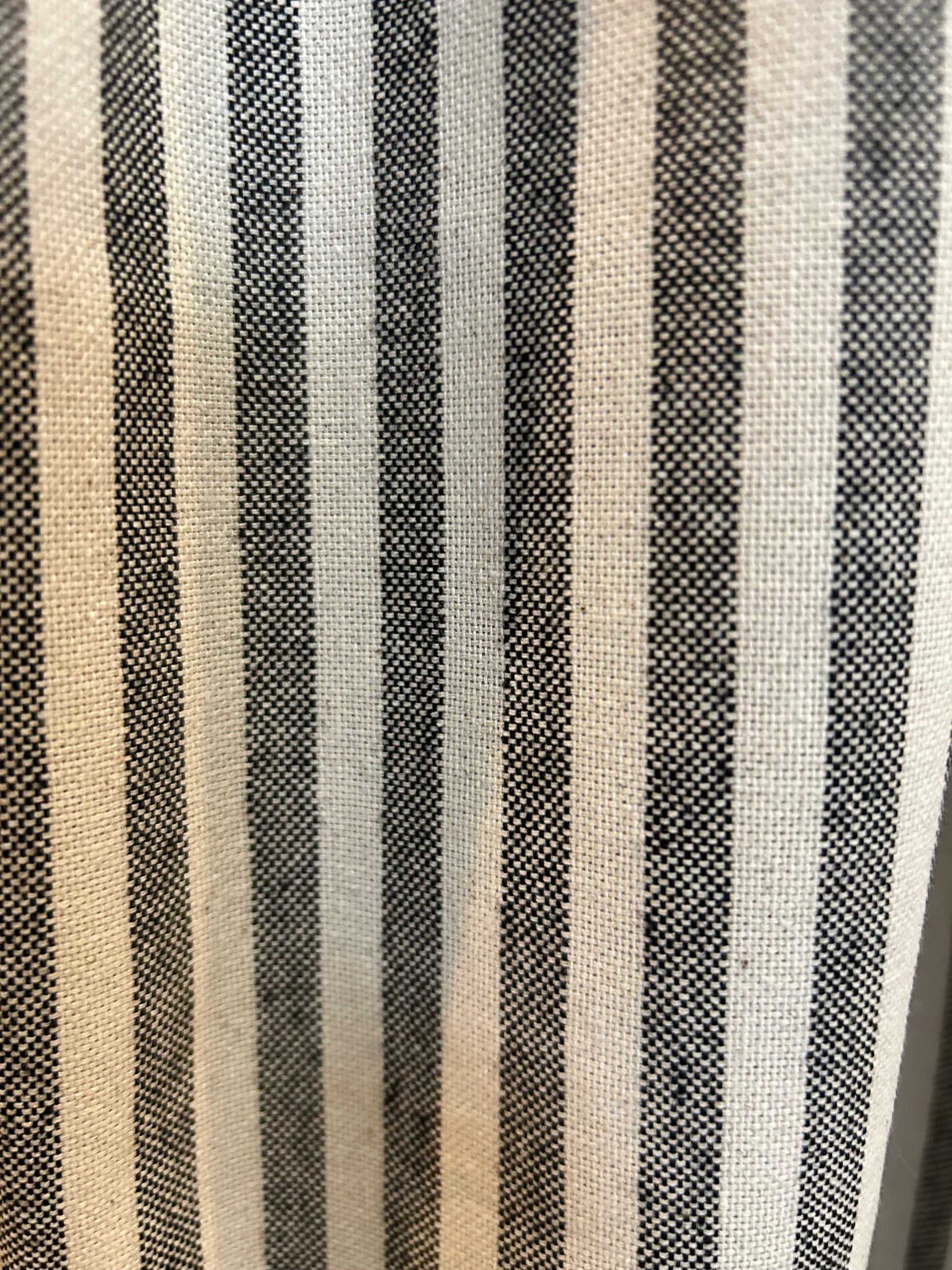 Striped Hideaway Curtain in natural and charcoal stripe. Perfect for hiding washing machines, appliances or even as an alternative to cupboard doors. Handmade using cotton fabric. Will fit 60cm wide space with gather as photographed or slightly wider space with less gather, with a 89cm drop and can be fitted using net curtain wire, or as we have a twist & fix rod.