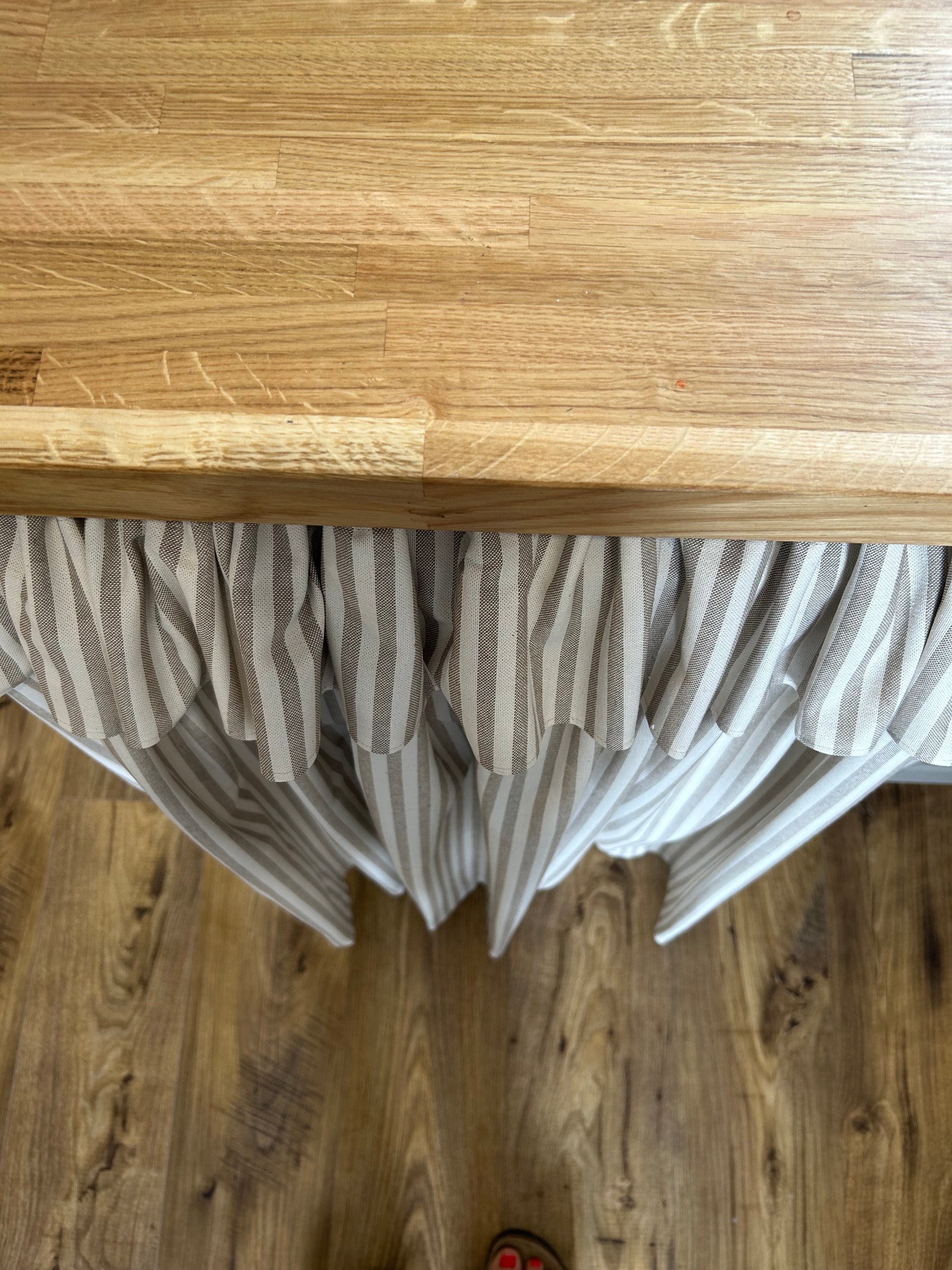 Striped Hideaway Curtain with Frill in natural and beige stripe. Perfect for hiding washing machines, appliances or even as an alternative to cupboard doors. Handmade using cotton fabric. Will fit 60cm wide space with gather as photographed or slightly wider space with less gather, with a 89cm drop and can be fitted using net curtain wire, or as we have a twist & fix rod.